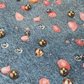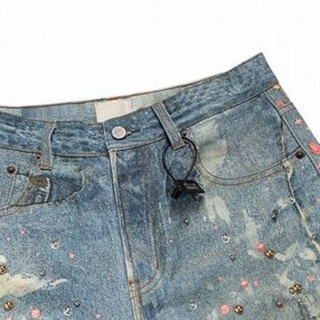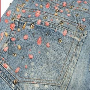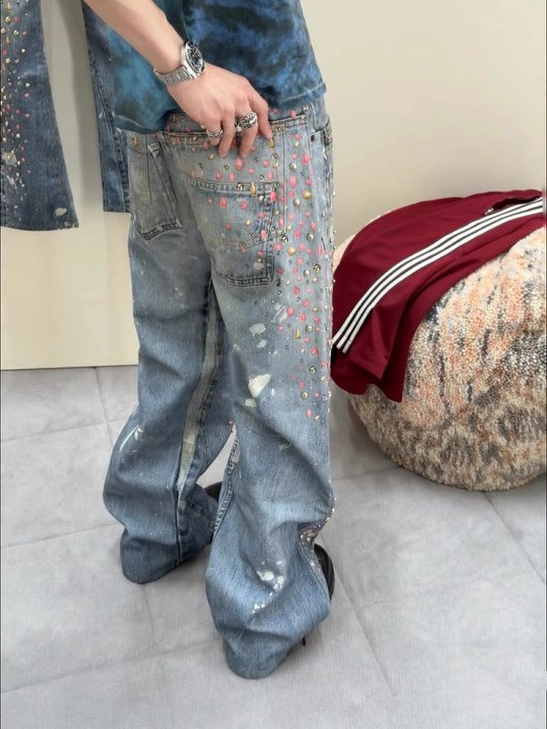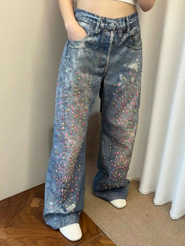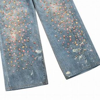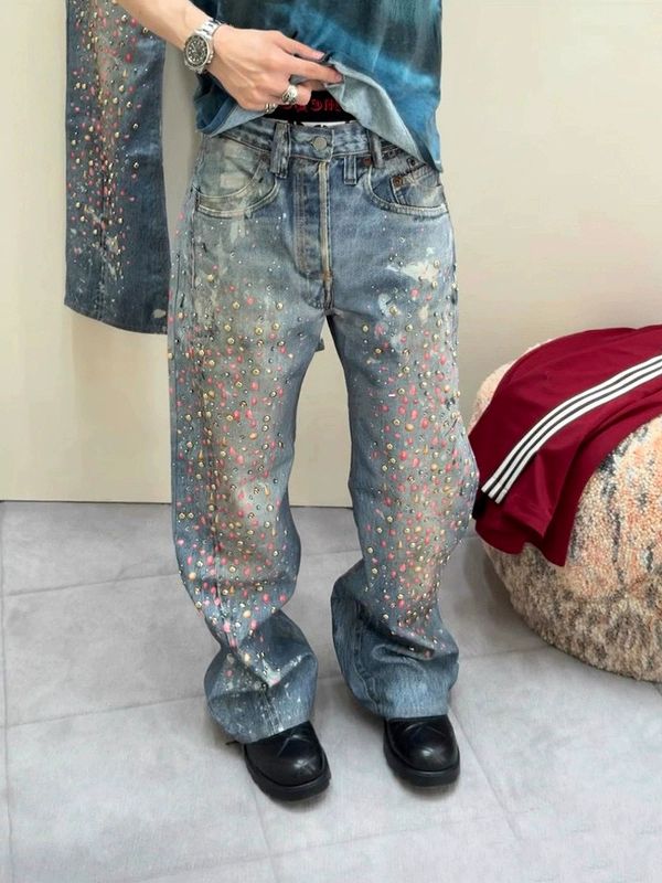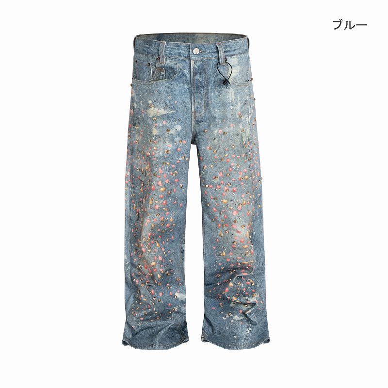 全面に散りばめられたラインストーンとダメージ加工が印象的なワイドシルエット。