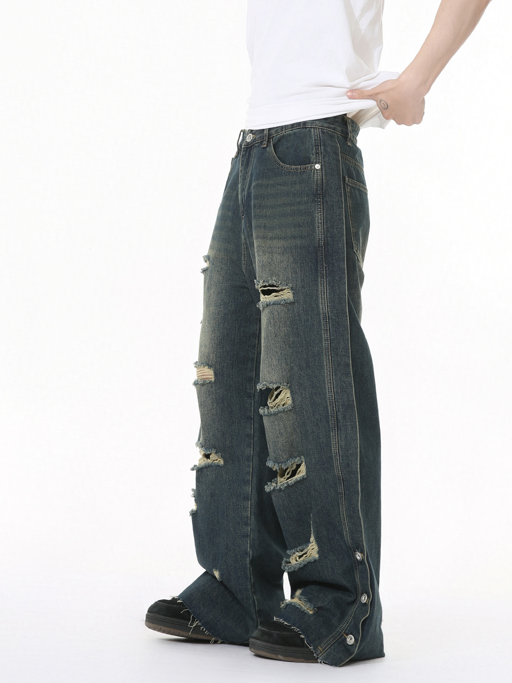 トレンド感のあるダメージ加工を施したメンズデニムパンツです。