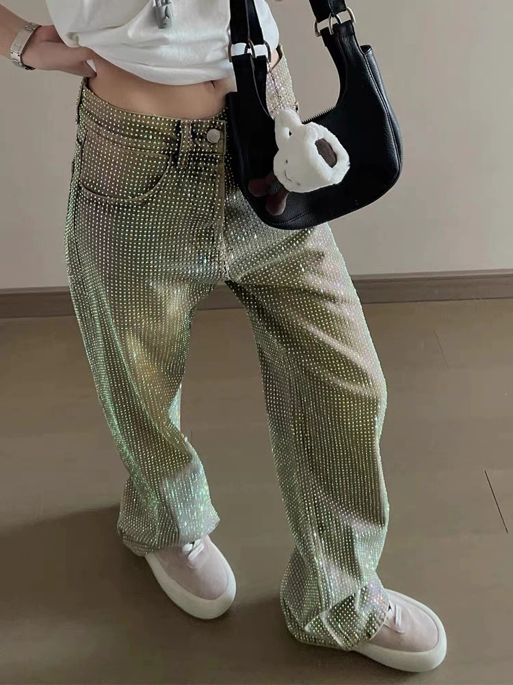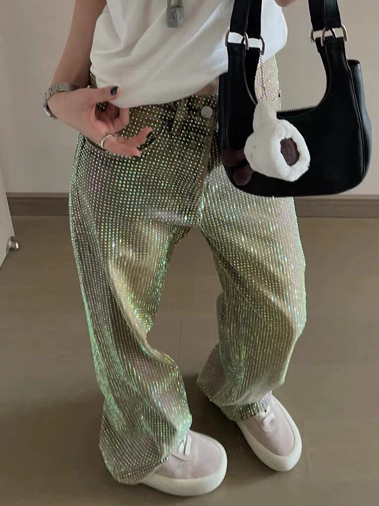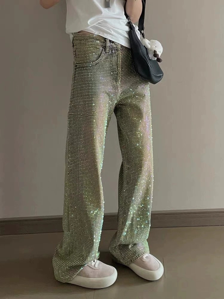 きらめくライトストーンをふんだんにあしらったワイドシルエットのメンズデニムパンツです。