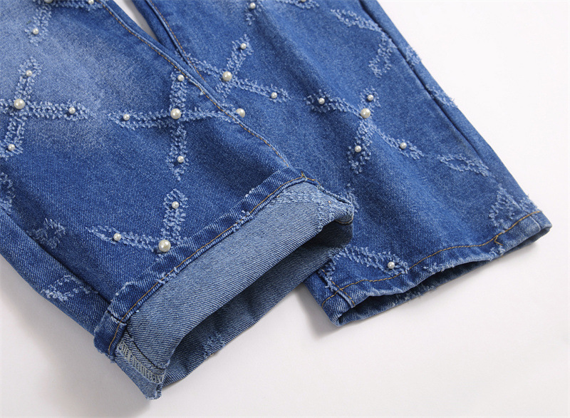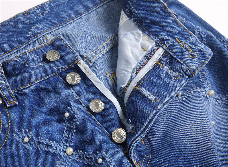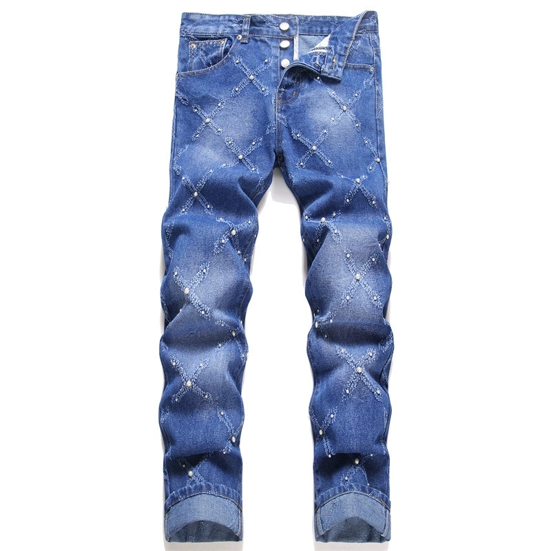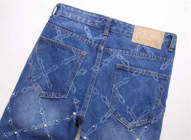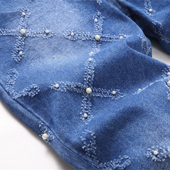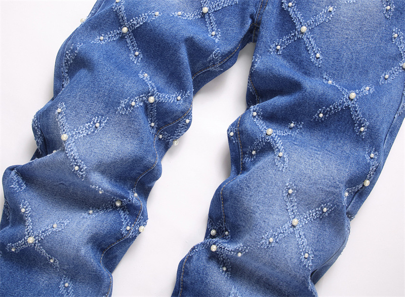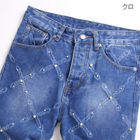 キラキラと輝くラインストーンが散りばめられた、個性的なダイヤ柄のスキニーデニムパンツです。