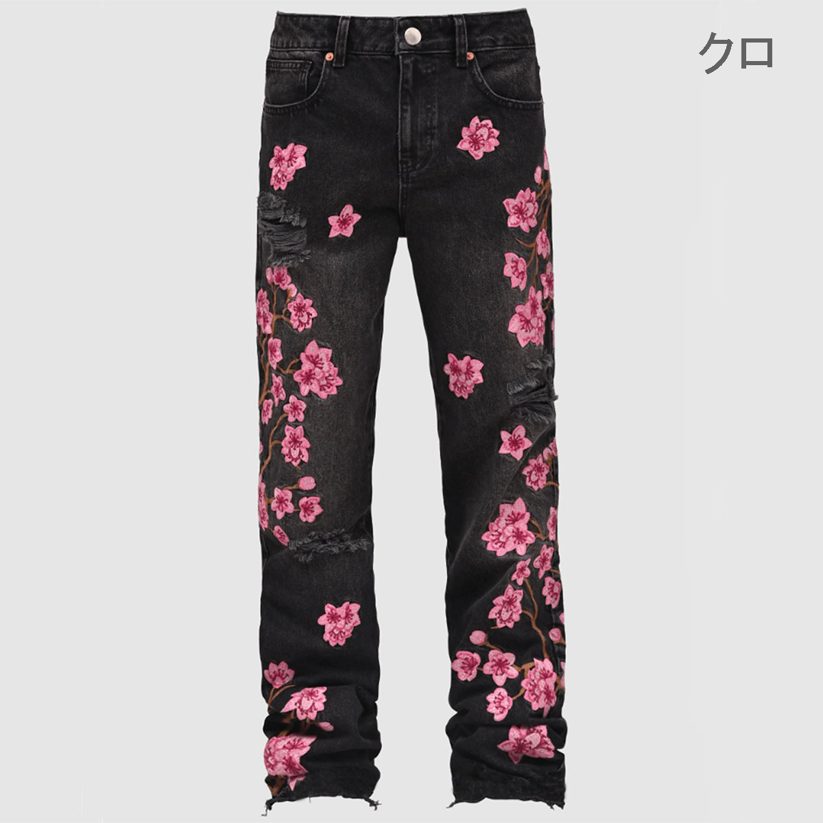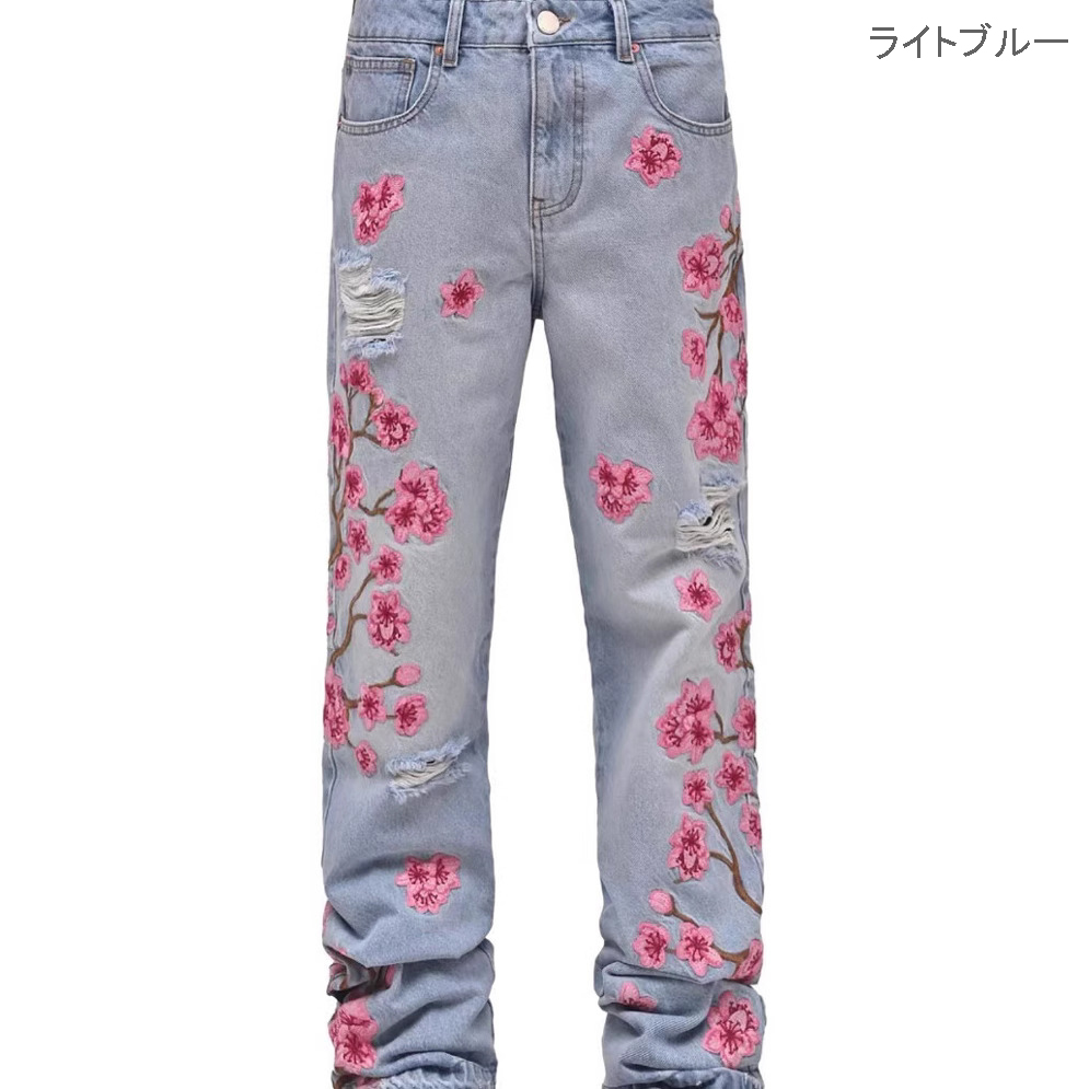 ダメージ加工とピンクの花柄刺繍でストリート感あふれるデザイン。
