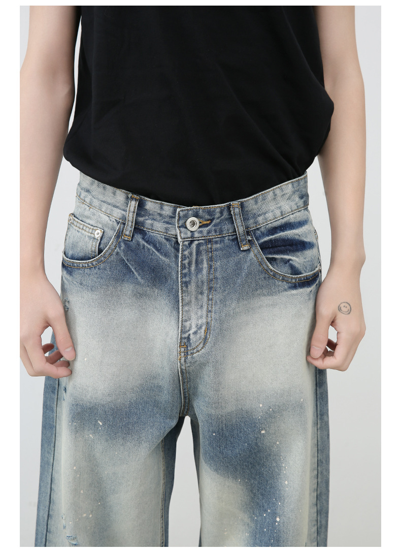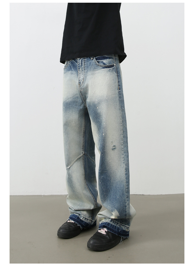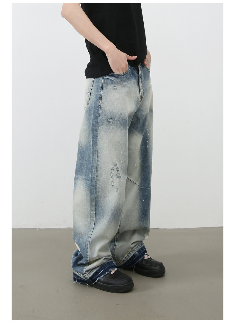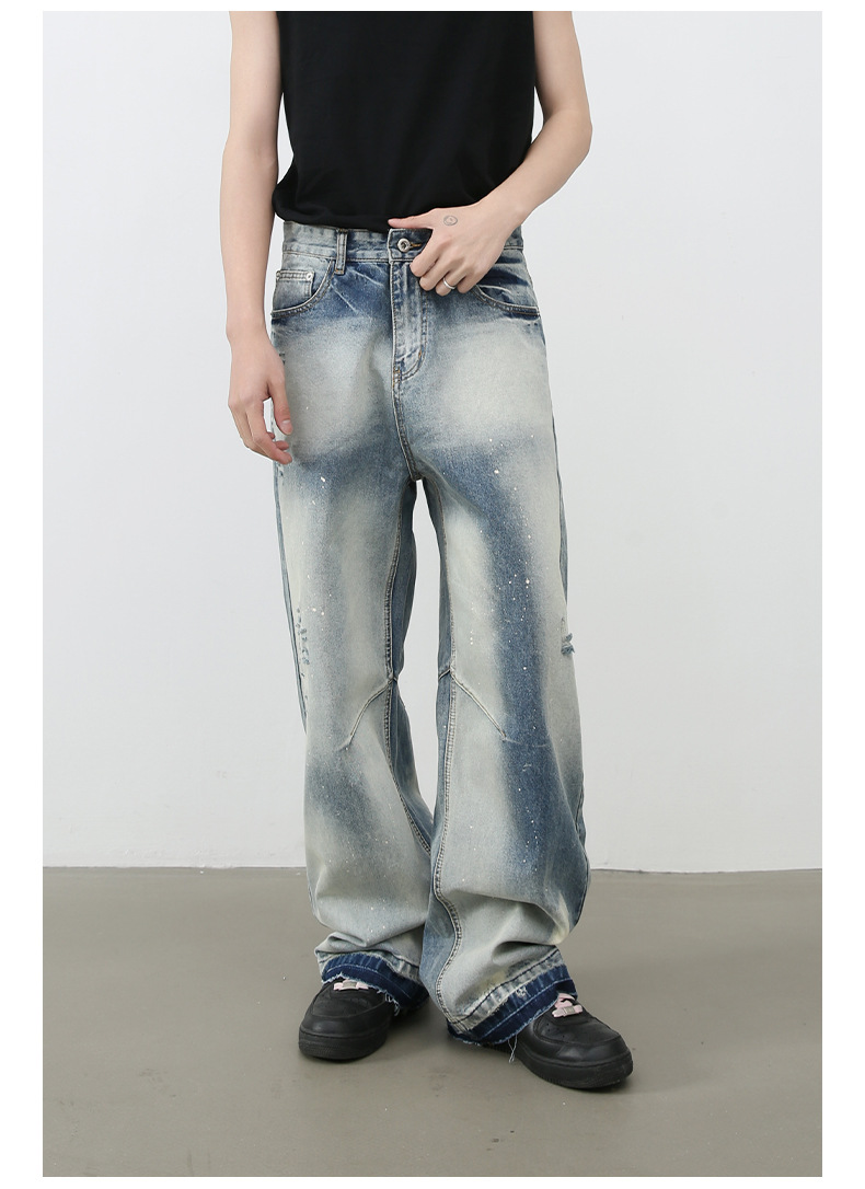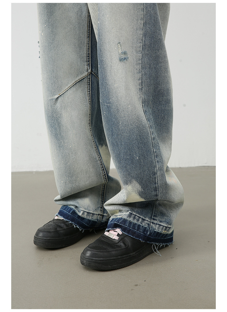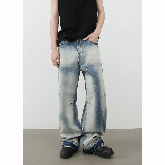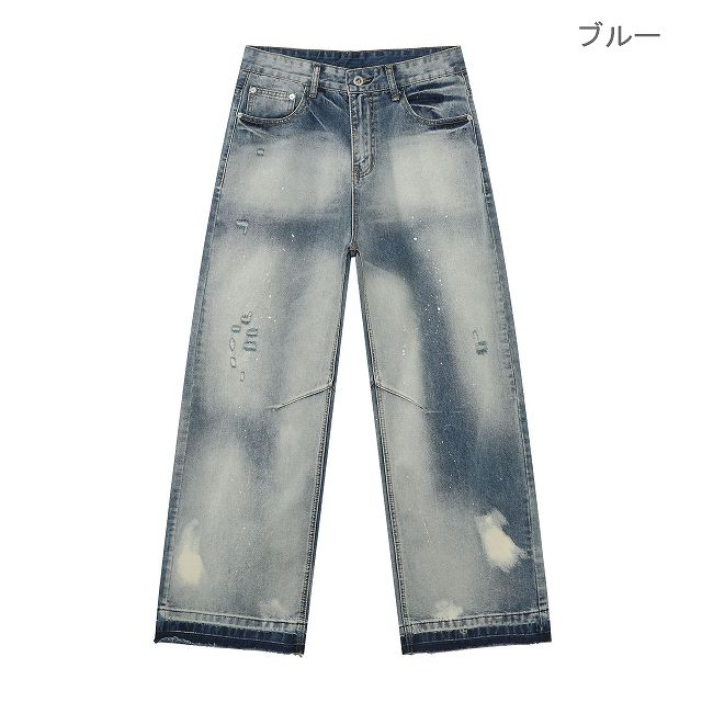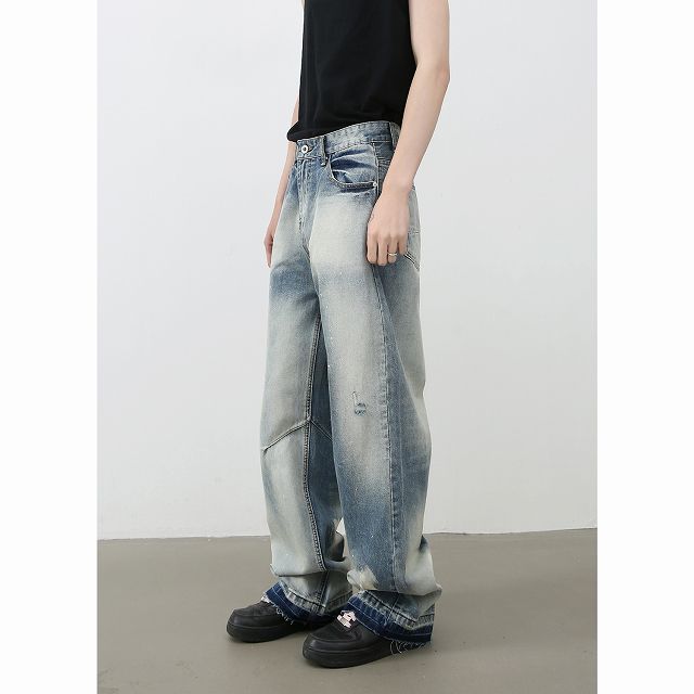 個性的なダメージ加工とヴィンテージ風の色落ちが魅力的なメンズデニムパンツです。