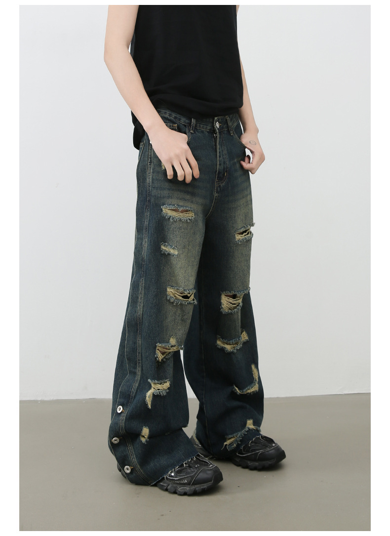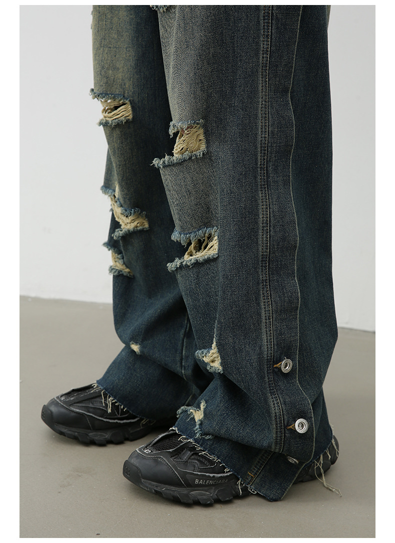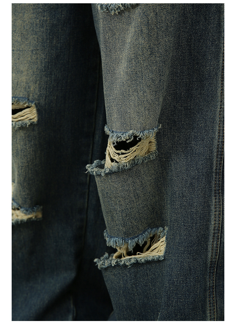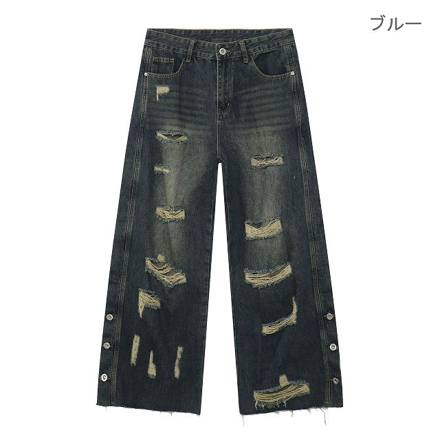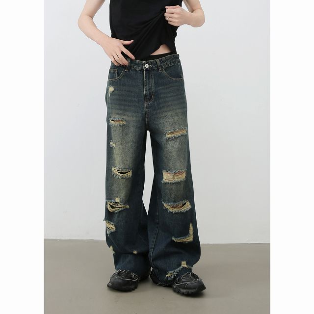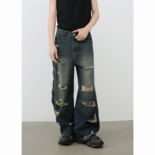 全体に散りばめられた破れとヴィンテージ感のある色落ちが特徴的。