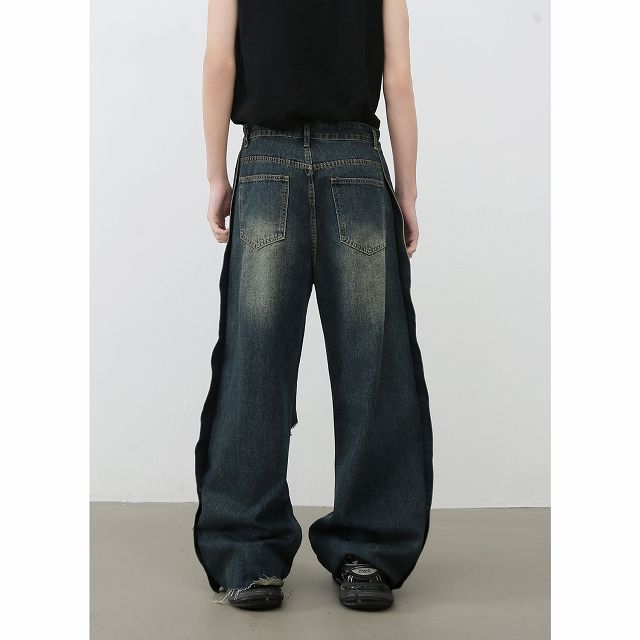 こだわりのダメージ加工が施されたメンズデニムパンツ。